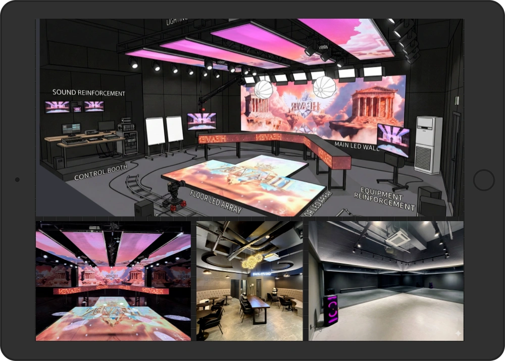 강남구청역 인근 120평 (20인)대형 LED 호라이즌과 미니 스튜디오, 댄스 연습실까지. 고퀄리티 라이브와 영상 제작에 집중할 수 있는 환경을 제공합니다. 엑셀 스튜디오, 댄스 연습실, VIP 대기 공간까지 체계적으로 구성되어 있으며, 필요 시 안무 개발, 음원 제작, 브랜딩 디자인 등 제작 서비스도 함께 지원합니다. 또한 인천에 있는 미니스튜디오 (8인)청라점도 대관 서비스 중입니다.