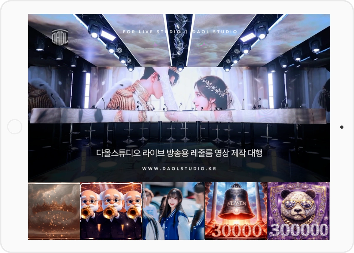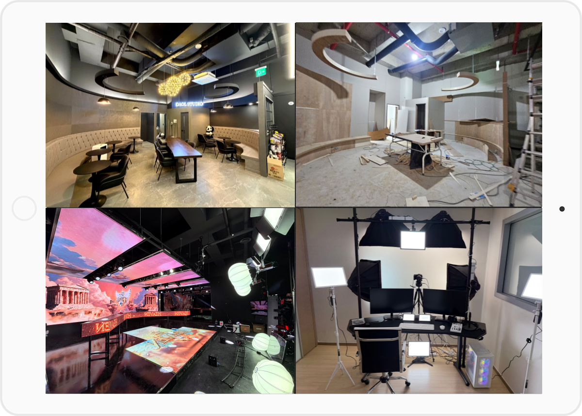 다올스튜디오는 대관과 설치 업무 외에도 많은 방송 경험을 가진 각 분야의 전문 제작팀이 엑셀 방송과 다양한 크루 콘텐츠의 기획부터 실시간 운영, 송출까지 전 과정을 안정적으로 지원하는 올인원 시스템을 지원합니다. 레졸룸 영상, 브랜딩, 시그니처 이미지, 음원, 안무 까지 모두 가능하며 단발성 &장기 협업도 가능합니다.